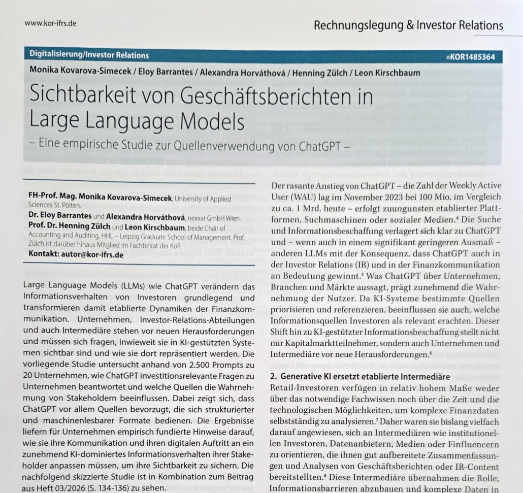 Large Language Models (LLMs) wie ChatGPT verändern das Informationsverhalten von Investoren grundlegend und transformieren damit etablierte Dynamiken der Finanzkommunikation. Unternehmen, Investor-Relations-Abteilungen und auch Intermediäre stehen vor neuen Herausforderungen und müssen sich fragen, inwieweit sie in KI-gestützten Systemen sichtbar sind und wie sie dort repräsentiert werden. Die vorliegende Studie untersucht anhand von 2.500 Prompts zu 20 Unternehmen, wie ChatGPT investitionsrelevante Fragen zu Unternehmen beantwortet und welche Quellen die Wahrnehmung von Stakeholdern beeinflussen. Dabei zeigt sich, dass ChatGPT vor allem Quellen bevorzugt, die sich strukturierter und maschinenlesbarer Formate bedienen. Die Ergebnisse liefern für Unternehmen empirisch fundierte Hinweise darauf, wie sie ihre Kommunikation und ihren digitalen Auftritt an ein zunehmend KI-dominiertes Informationsverhalten ihrer Stakeholder anpassen müssen, um ihre Sichtbarkeit zu sichern. Die nachfolgend skizzierte Studie ist in Kombination zum Beitrag aus Heft 03/2026 (S. 134-136) zu sehen.